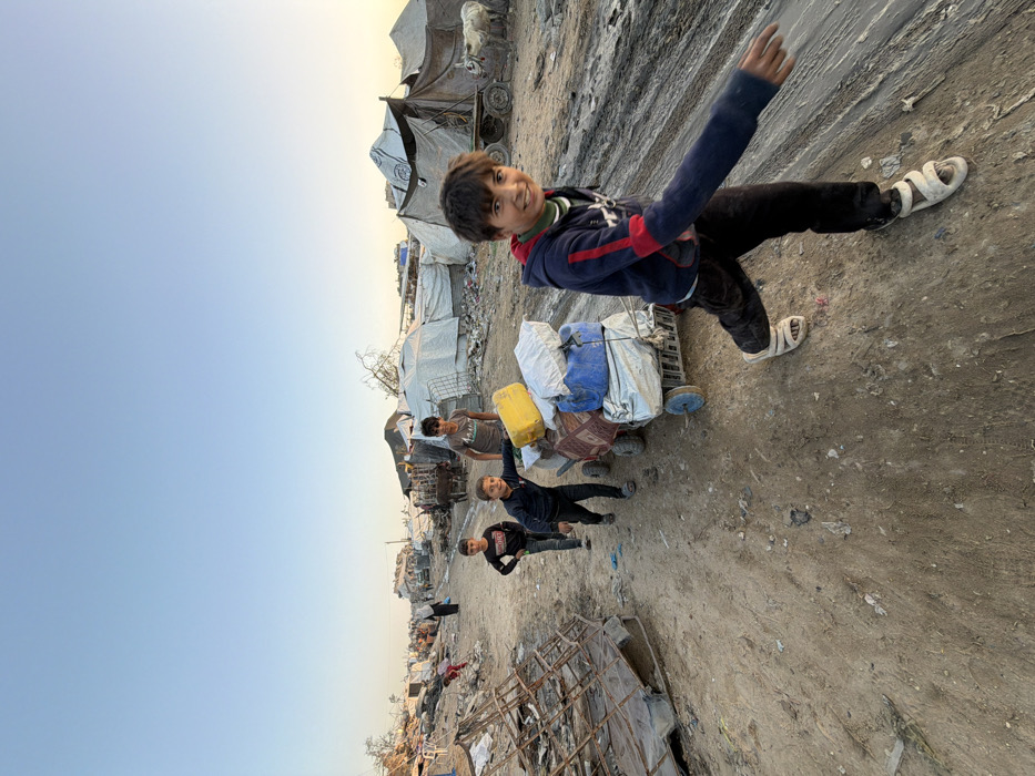 In a dusty, impoverished landscape, three young boys are seen pulling a small cart loaded with water jugs and covered bundles. The foreground boy smiles and reaches out with one arm. Behind him, another boy grips the cart, while a third boy poses casually. Makeshift shelters and debris line the horizon, suggesting a refugee camp or impoverished settlement. The light is soft, implying either early morning or late afternoon.