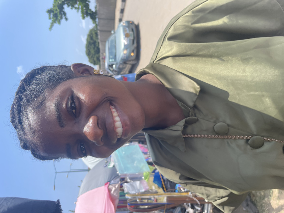 A young female, of apparent African descent, is centrally positioned and smiling directly at the camera in Ajara, Nigeria. She has dark skin, braided hair, and wears a short-sleeved, collared, olive-green satin-like shirt with large round buttons. A gold-colored chain is visible over her left shoulder. A gold-colored earring with a white spherical drop is visible in her right ear. The scene is brightly illuminated by daylight. The background to the left is blurred, revealing elements consistent with a street market, including a partially visible pink and white striped umbrella, various items hanging, and general merchandise. To the right, a light-colored sedan is in motion on a paved road, separated by a curb. A concrete wall and distant foliage are visible beyond the road, beneath a clear blue sky.