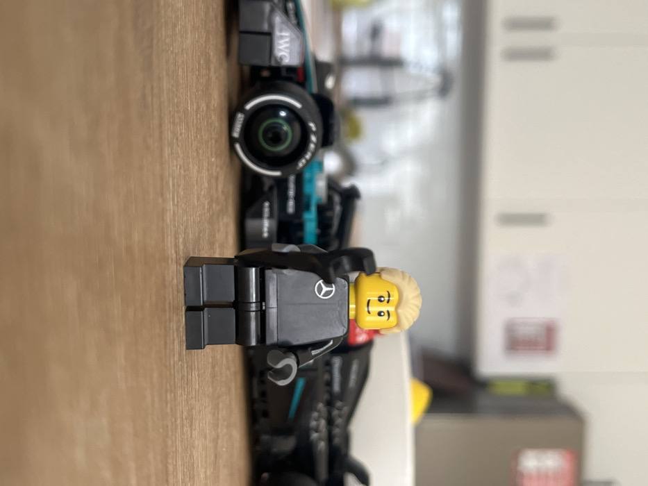 The scene is situated in the city of Ras Al-Khaimah, United Arab Emirates. A Lego minifigure stands prominently in the foreground on a light brown wooden surface. This minifigure features a yellow head with a smiling expression, blonde hair, a black torso bearing a white Mercedes-Benz logo, black legs, and light grey hands, with its right arm slightly elevated. Behind and to the left of the minifigure, a black and teal Lego model of a Mercedes-AMG Petronas Formula 1 car is partially visible and slightly out of focus. Notable details on the car include 'IWC' branding on the front wing and 'P ZERO' and 'IRELLI' text on the visible front tire. The background consists of a blurred indoor environment, characterized by white cabinet doors or panels and other indistinct elements, suggesting a kitchen or similar domestic setting.
