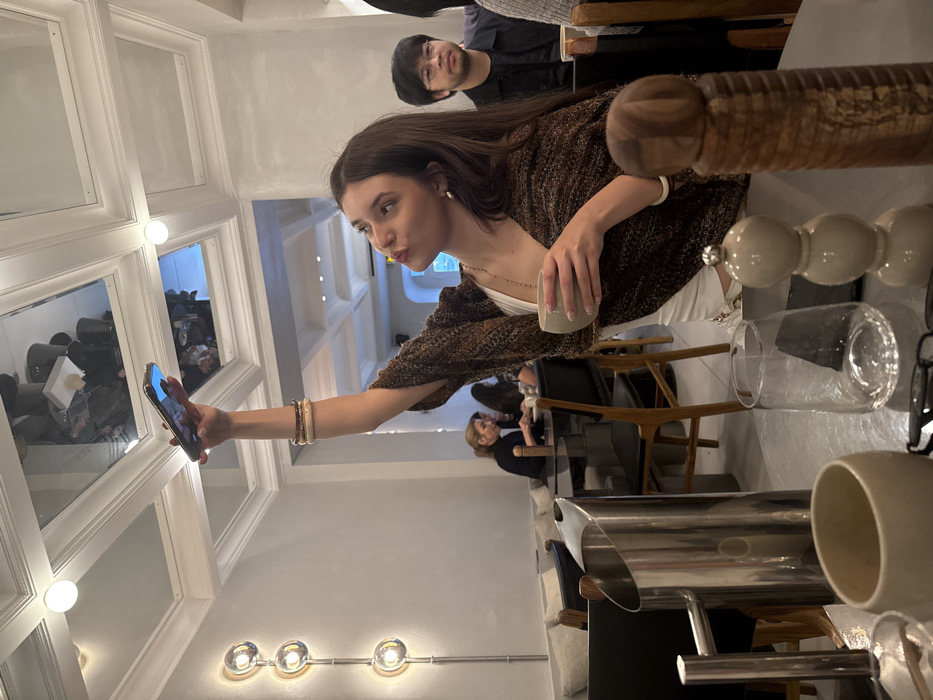 An interior shot depicts a restaurant or café in Paris, France, featuring a young woman engaged in taking a photograph. She is positioned center-right, looking upward and to her left with puckered lips, holding a smartphone overhead with her right arm extended. Her left hand holds a light beige cup. She wears a white top and a textured brown knit shawl, accessorized with multiple bangles on her right wrist and a gold earring. To her right, a young man with dark hair and glasses is partially visible, seated and looking to the right. In the background, other patrons are seated at dark tables and booths, including a woman with blonde hair in a black top. The foreground table holds a silver pitcher, a small beige ceramic cup, an empty clear glass, a beige ceramic salt/pepper shaker, and a tall wooden salt/pepper mill. The establishment features a white coffered ceiling with recessed lighting and square mirrored panels, reflecting the room's activity. Wall-mounted spherical light fixtures are visible on the left wall.