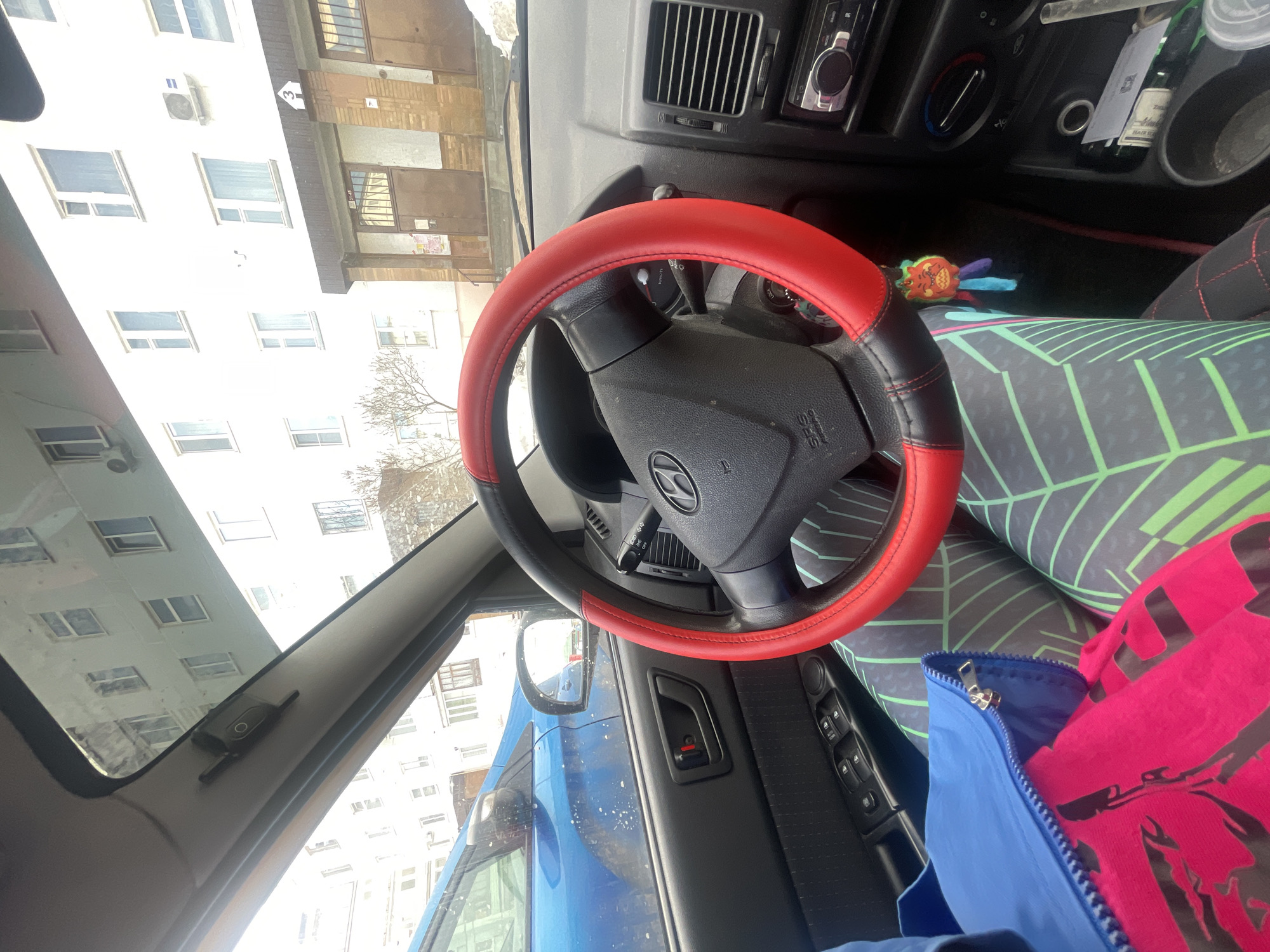 The image displays a first-person perspective from the driver's seat of a vehicle in Chaikovsky, Russia. The vehicle's interior features a black dashboard and a steering wheel fitted with a red and black cover, bearing a Hyundai emblem. A colorful, monster-shaped keychain with fabric tassels hangs from the steering column. The driver's legs are partially visible, clad in dark leggings with a bright green geometric pattern. A blue jacket and a magenta-colored item are resting on the driver's lap. The center console includes cup holders containing papers, currency, and a plastic straw. Through the windshield, a multi-story, light-colored residential building is visible. The building features numerous rectangular windows and external air conditioning units mounted on its facade. Its ground-level entrance has a dark brown door, marked with "31-45" above it and a white house-shaped sign displaying the number "3". To the left, a dirty blue car is parked, partially obstructing the view. The exterior environment indicates cold weather, with patches of snow on the ground and bare deciduous trees beneath an overcast sky.
