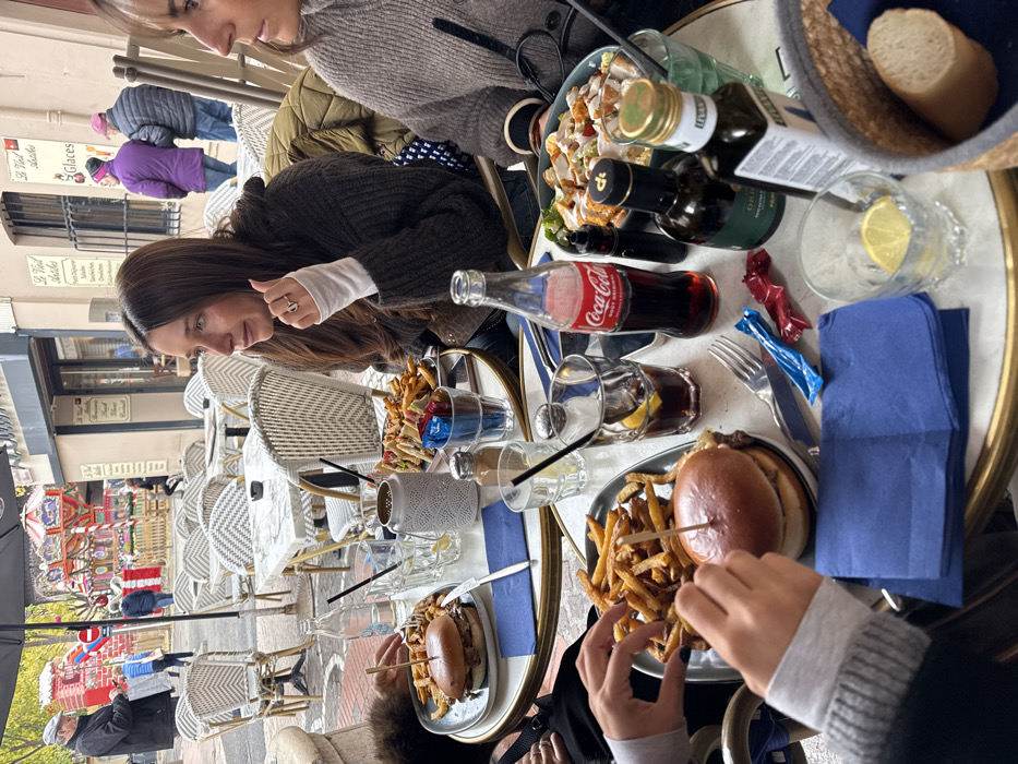 The image depicts an outdoor cafe scene on a cobblestone street in Antibes, France. In the foreground, three individuals are seated around two adjacent round tables with white marble-patterned tops and gold-colored frames. A large black outdoor umbrella provides shade overhead. On the left, a person's hands, wearing a grey long-sleeved top, are seen reaching for french fries on a grey plate. This plate also holds a burger with a wooden skewer. Further on this table are a glass bottle of water, a glass with a straw, and blue paper napkins. In the center, a woman with long dark hair, wearing a dark brown knitted sweater over a white long-sleeved top, is seated. She has a ring on her left ring finger and is looking towards the left side of the frame. In front of her is a plate containing a sandwich (possibly a club sandwich) and french fries, along with a white ceramic container. On the right, partially visible, another woman wearing a light brown or grey knitted sweater is seated, also looking towards the left. The table in front of her holds a bottle of Coca-Cola, two glasses (one with ice and lemon, another with a straw), salt and pepper shakers, two bottles of olive oil (one dark green, one clear), and a large bowl of what appears to be a chicken Caesar salad. A small basket containing a piece of bread is also present. Scattered on the table are small wrapped candies in red and blue wrappers, along with cutlery. The background shows a pedestrian street with light-colored buildings featuring shop windows. One visible sign reads "Le Viol d'Antibes Glaces" with cherry illustrations. Several blurred figures are walking on the pavement; a man in a dark jacket and cap carrying a light-colored bag is visible on the far left. Further down the street, a colorful, multi-tiered carousel or similar festive attraction with red and white elements is observed.