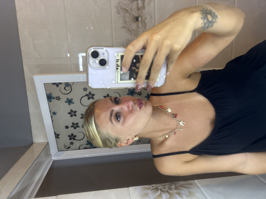 A woman in a black top is taking a selfie. She is holding her phone with her left hand. Her phone has a clear case with little white hearts on it and a photograph inserted. She has blonde hair pulled back and a gold necklace with charms. She is wearing gold earrings. A gray tiled wall and mirror are behind her. Her left arm has a visible tattoo.