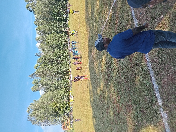 An outdoor sports field in Meru, Kenya, is depicted under a clear blue sky with minimal cloud cover