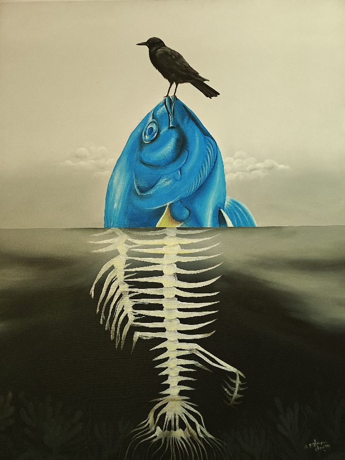 This image is an artwork, a painting or digital illustration, depicting a surreal, bipartite scene. It does not represent a specific, verifiable physical location within the city of Kochi, India. The composition is horizontally divided. The upper half features a light grey sky with faint, wispy white clouds. From an indistinct boundary, a large, vibrant blue fish head emerges, facing slightly to the right with its left eye prominent. A black crow with dark plumage is perched atop the fish's head, facing left. The lower half of the image portrays a dark, murky underwater environment. Directly beneath the blue fish head, a pale, yellowish-white skeletal structure, resembling a fish's spine and rib cage, is submerged. Faint, darker forms, possibly aquatic vegetation, are visible at the bottom left. No people or man-made objects are present. The crow is static on the fish head, and the skeleton remains still in the water, creating a stark contrast between the vibrant surface and the skeletal depths.