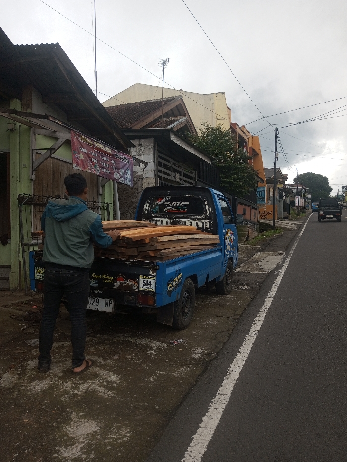 A man stands by a blue pickup truck filled with wood planks. He wears a jacket, jeans, and sandals. The truck is parked on a roadside next to a building. Another vehicle drives down the road. The scene is overcast, and the buildings are a mix of old and newer styles. Power lines run overhead.