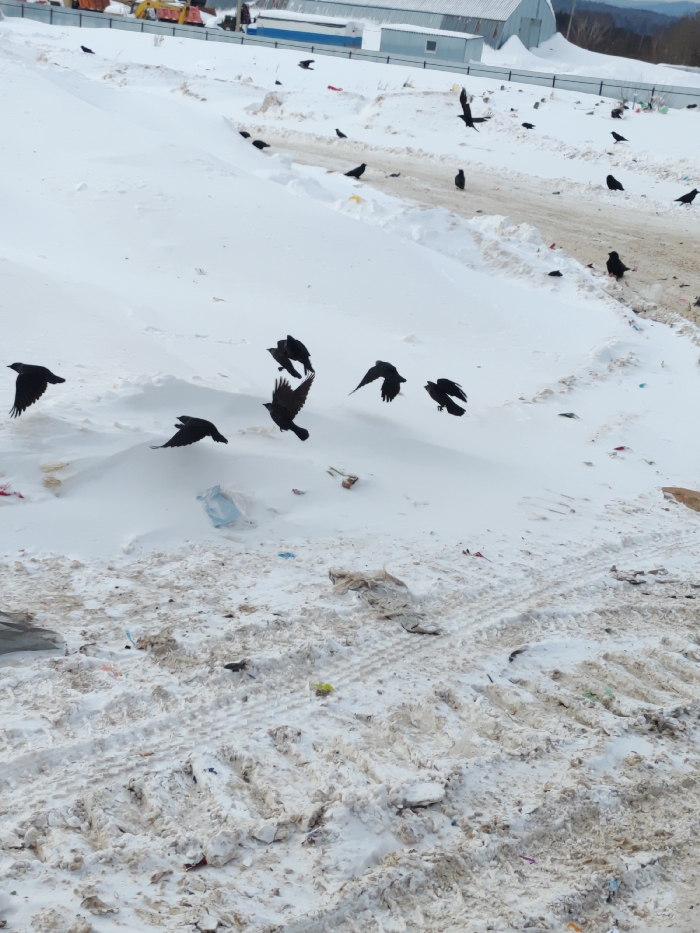 The image presents a snow-covered outdoor scene in Svetlyi, Russia. The foreground consists of dirty, partially melted snow intermingled with exposed soil and numerous vehicle tire tracks. Scattered throughout this area are pieces of refuse, including various plastic bags and unidentified debris. In the mid-ground, approximately twenty black birds, consistent with crows, are observed. Multiple birds are captured in various stages of flight with wings extended, while others are perched on snowdrifts or foraging on the ground amidst the litter. A light blue plastic bag is notably visible on a snowdrift. The background features an ascending snow-covered slope that leads to a section of exposed dirt. A fence line stretches horizontally across the mid-background, separating the foreground from a cluster of industrial structures. These structures include a low-rise building with a blue lower section and a white upper facade, adjacent to a larger corrugated metal warehouse. Partially visible yellow heavy machinery is situated behind the fence line. Distant, dark undulating landforms are discernible on the horizon beneath a muted, overcast sky. The birds are actively scavenging within the littered environment.