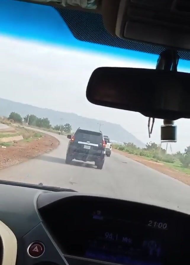 Alright, here's a concise description of the video: The video is shot from inside a moving car, looking out through the windshield. The car is traveling on a paved road with a slight curve, and there's a black SUV ahead of it. In the distance, there's another white truck or SUV. The landscape includes some greenery and a distant mountain range under a slightly overcast sky. The car's dashboard is visible, with the radio display showing 94.1 MHz. The rearview mirror is also in view, hanging above the dashboard. The overall scene appears to be a drive on a highway or major road in a somewhat rural area.