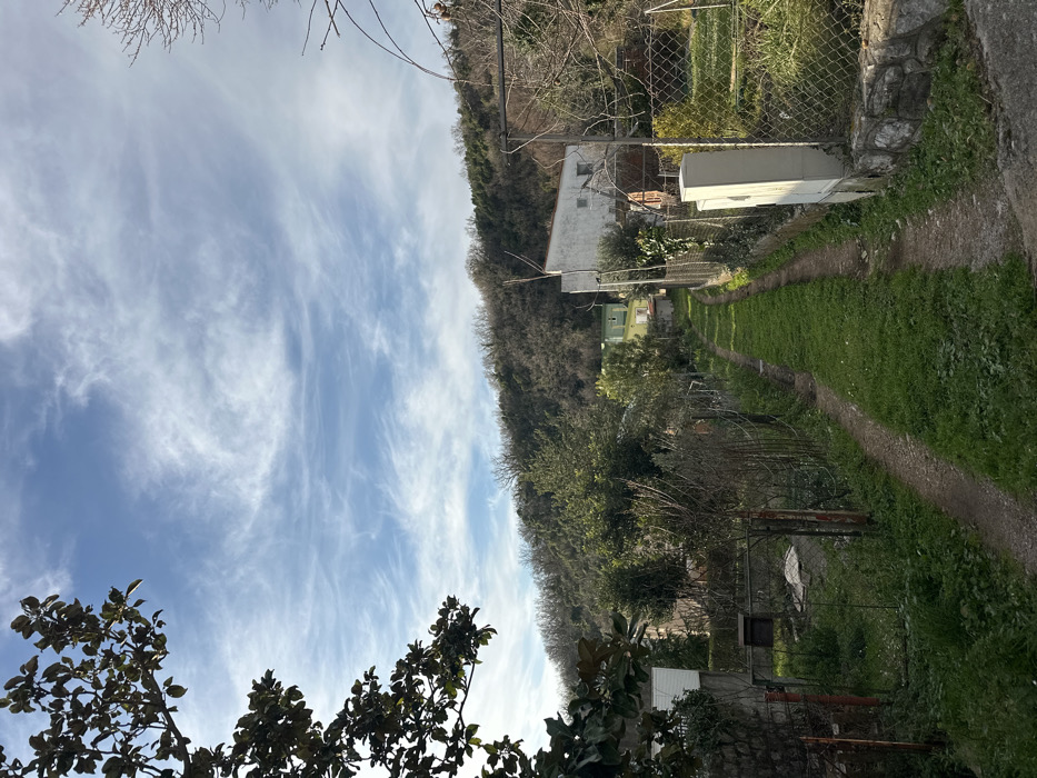 The image displays an unpaved rural path in Seoce, Montenegro, under a blue sky marked by wispy cirrus clouds. The path, covered in green grass, features two distinct dirt tracks running centrally, descending gently, and curving slightly to the left in the mid-ground. The path is bordered on both sides by chain-link fences, which are supported by metal posts and low stone wall foundations. On the immediate left, a dark-colored, rectangular object, possibly a mailbox, is attached to a fence post near a partially obscured metal gate. On the immediate right, two light-colored utility boxes are affixed to a fence support structure. Beyond the fences, the scene includes residential properties with various trees and vegetation. In the mid-ground, a white two-story building with a noticeable slanted roofline is visible on the right, partially obscured by bare tree branches. Further down the path on the left, a light green/teal building is partially visible amidst trees. The background is dominated by a steep, heavily wooded hill densely covered with trees, primarily deciduous, which appear bare of leaves. No individuals or animals are present in the depicted scene.