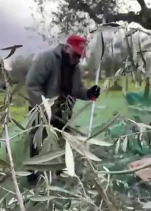 A man, wearing a red cap, sunglasses, a gray jacket, dark pants, and gloves, is pruning olive tree branches with a long-handled lopper