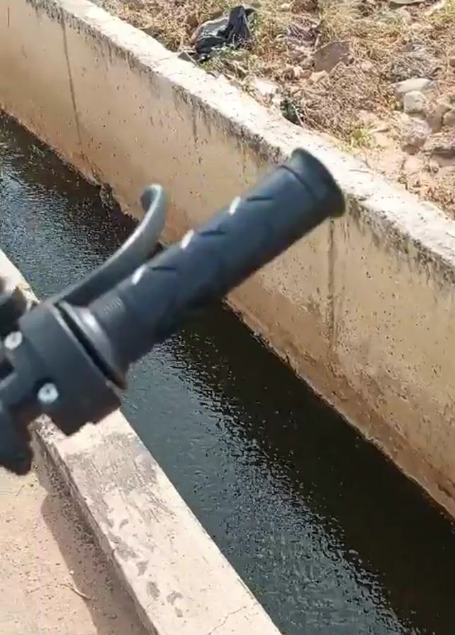 person sitting on a motorbike on a paved road. The person is looking down at a narrow, concrete drainage canal with water flowing through it. On either side of the canal, there is dry vegetation. In the distance, buildings and cars can be seen.