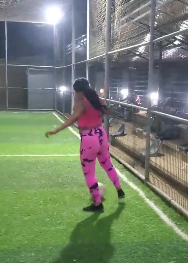A woman in a pink and black outfit runs towards a soccer ball on a green indoor soccer field. She kicks the ball with her left foot and lifts her right arm. A man in a yellow shirt walks in the background as she juggles the ball a few times. Another woman walks into frame wearing a white shirt and black pants. The video appears to be filmed at night, with bright overhead lights. The field is surrounded by netting.
