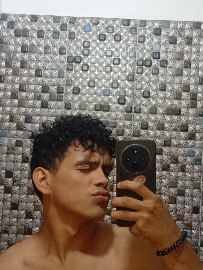 - "A fair-skinned, shirtless man with curly black hair takes a selfie in front of a tiled wall with a geometric pattern" by FM-xUvng2, licensed under CC BY 4.0