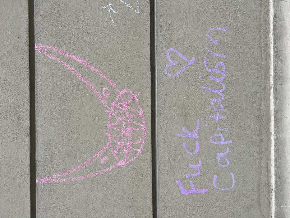 The image displays an exterior wall at an unidentified location in the city of Warsaw, Poland, featuring multiple instances of chalk graffiti. The wall exhibits a light beige, textured surface with two pronounced horizontal grooves, dividing it into visible upper and middle sections. In the upper section, a stylized drawing rendered in bright pink chalk depicts an arc-shaped, monster-like face or crescent moon. This figure includes two small circular eyes, two prominent horn-like or ear-like extensions curving upwards from its sides, and a wide, open mouth filled with jagged, pointed teeth. To the right of this drawing, a faint, small white chalk mark, possibly resembling an arrow or letter 'Z', is partially visible. In the middle section, below the pink drawing and between the two horizontal grooves, the phrase "Fuck Capitalism" is written in purple chalk. To the right of this text, a small heart symbol is also drawn in purple chalk. No individuals are present in the scene; the chalk graffiti is the primary subject. The lighting suggests daytime conditions.