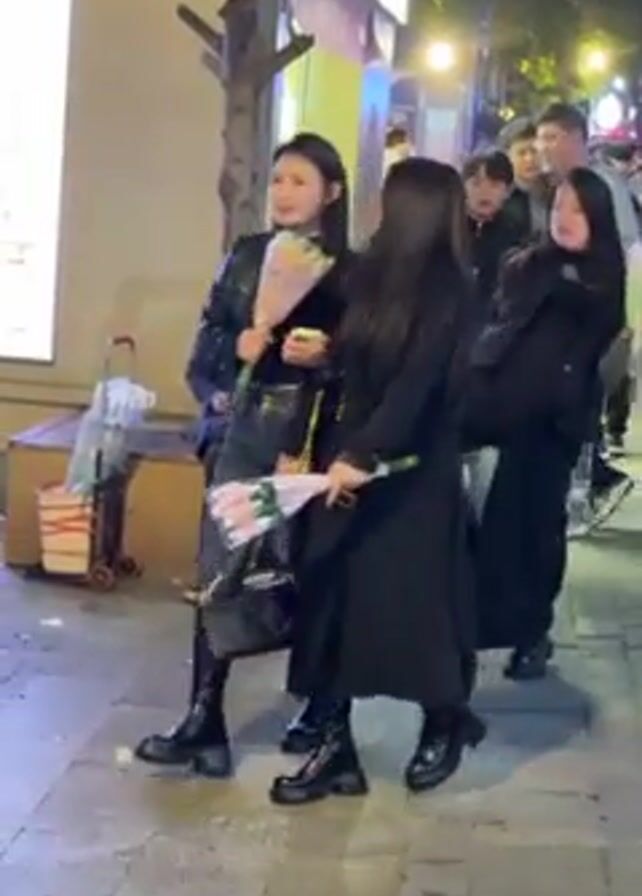 group of four young women standing on a sidewalk at night. They are all holding bouquets of flowers wrapped in clear plastic. The woman on the left is wearing a black leather jacket, jeans, and black boots. The other three women are wearing black coats. A young child in a white outfit approaches the group and reaches for the flowers. Other people can be seen walking on the sidewalk in the background, as well as a man sitting on a bench and pushing a cart. The area appears to be a commercial district with storefronts and streetlights.
