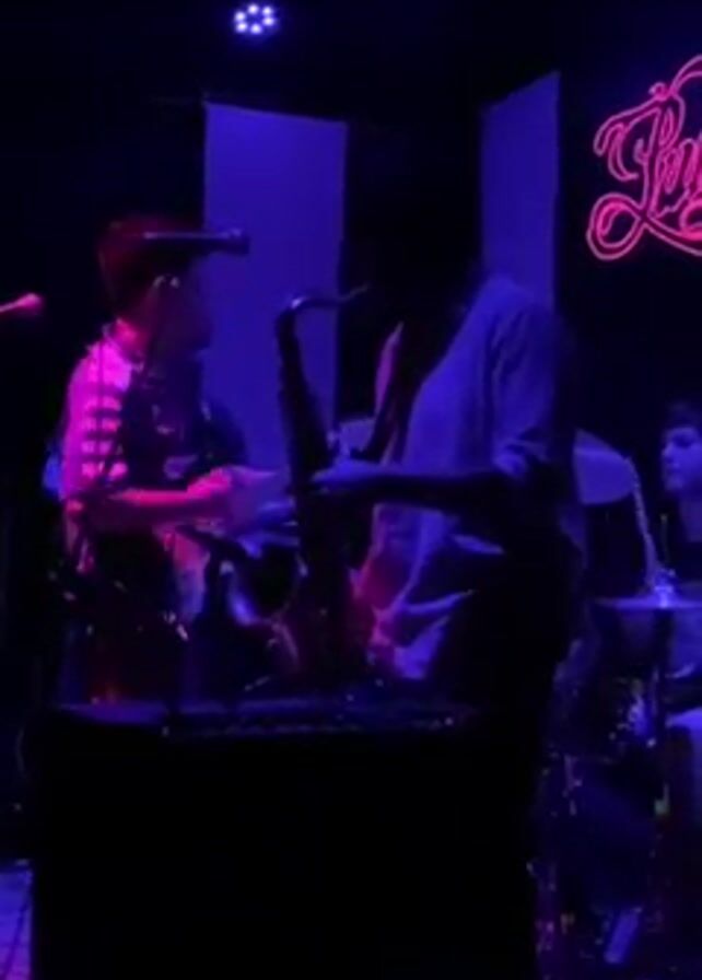 A live band is performing on a small stage under purple and blue stage lighting. A guitarist wearing a pink striped shirt is on the left, and a saxophonist in a light-colored shirt stands in the center. Behind them, a drummer is visible, keeping time on his kit. In the background, there is a black and white backdrop and a neon sign with cursive writing. Microphones are set up on stage.