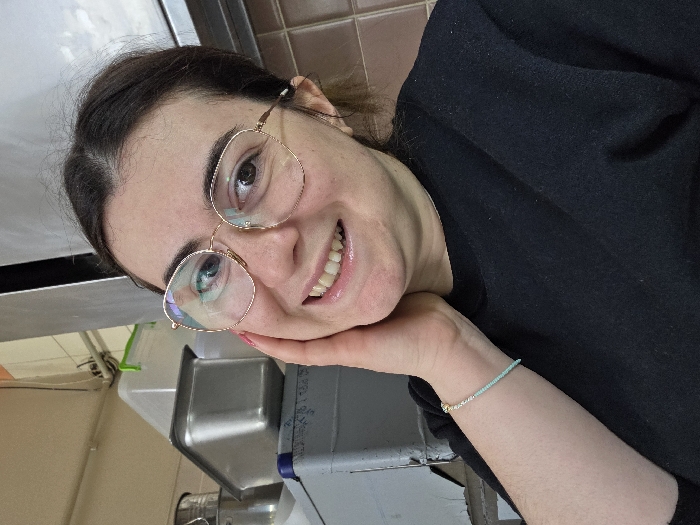 An indoor, close-up image captures a female individual with dark hair and gold-rimmed glasses smiling directly at the camera, her left hand gently touching her cheek. She wears a black long-sleeved shirt and a light blue beaded bracelet on her left wrist. The background, visible primarily in the upper left and right, consists of an industrial kitchen or food preparation area. Visible objects include stainless steel containers, white plastic storage bins (one with a green lid), and a grey plastic crate with a blue rim. Walls appear to be light-colored, with some visible wiring, and a vertical metallic surface is present on the right. This scene is located in the city of Gevgelija, North Macedonia.