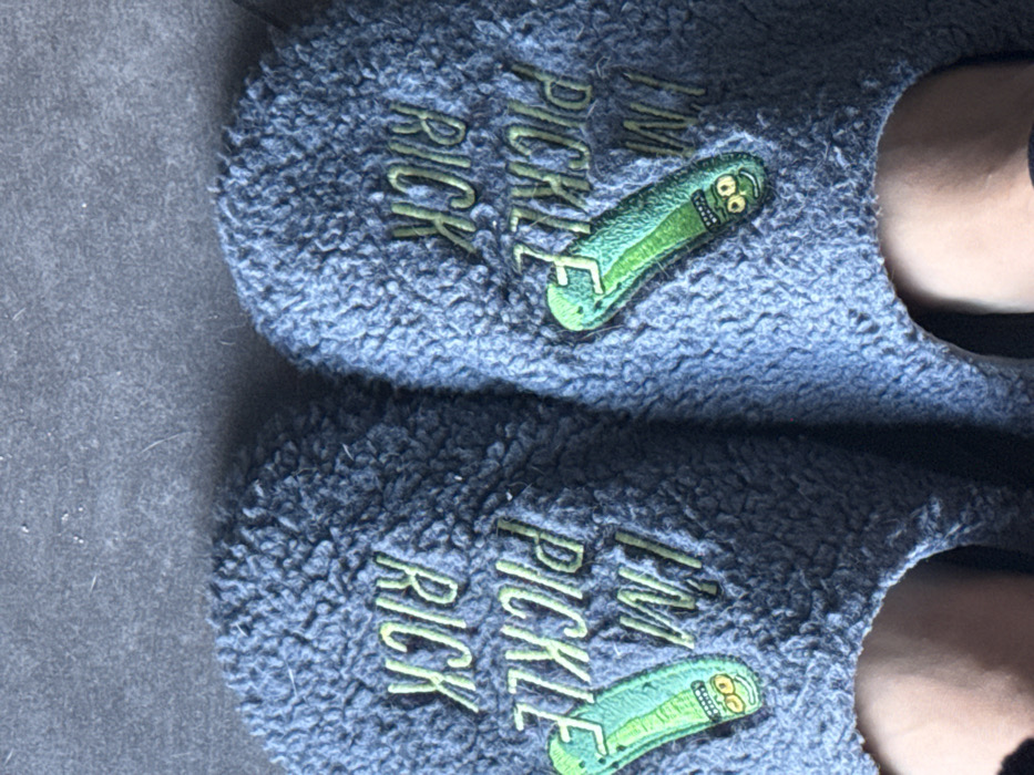 A top-down photographic view displays a pair of feet wearing matching grey-blue, fuzzy slippers on a dark grey, textured surface, likely a floor, within a location in Limeil-Brévannes, France. Each slipper is embroidered with lime-green text reading "I'M PICKLE RICK" and features a prominent embroidered patch depicting a cartoon green pickle character with facial features. The bare forefeet of an individual, exhibiting a fair skin tone, are visible protruding from the front openings of the slippers. No further subjects, objects, or actions are discernable.