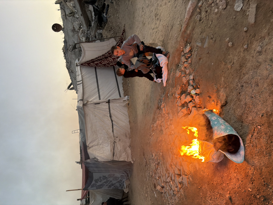 Two people sit on blankets outside tents, near rubble. A fire burns brightly in a metal basin, with debris around it. The sky is overcast and pale, suggesting dusk or dawn. The setting appears desolate and possibly impoverished.
