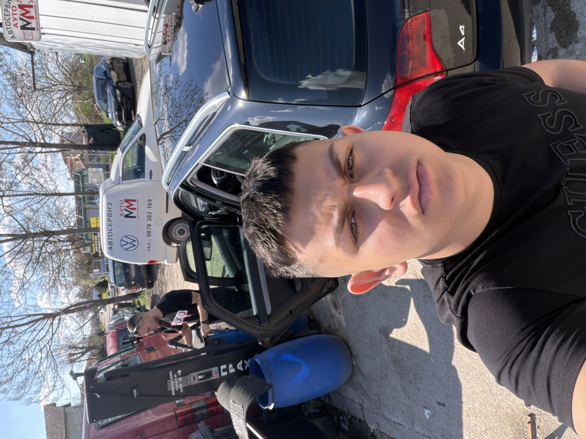 selfie of a man with short dark hair wearing a black t-shirt. He is positioned in front of several vehicles, including a dark blue Audi A4 and a white van with "АВТОСЕРВИЗ" (Auto Service) written on it in Bulgarian. A blue plastic container sits on the ground next to the open door of a vehicle. In the background, another person is visible, and there are various other vehicles and buildings. The location is likely in Dolni Dabnik, Bulgaria, based on the Bulgarian writing on the van. The environment appears to be an outdoor auto repair setting.