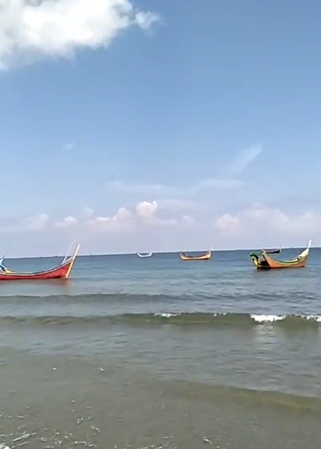 beach with several brightly painted fishing boats floating on the water. The sky is blue with a few white clouds. The water has small waves rolling in. The video is shot from the shore, looking out over the water towards the horizon.