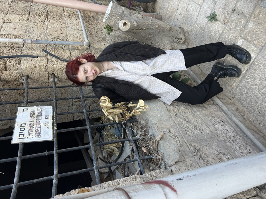 The image displays an individual standing on a stone-paved path in the Old City of Jaffa, part of Tel-Aviv, Israel. The individual, appearing female, has reddish-brown, medium-length hair and fair skin, with a small dark mark below the left eye and dark eyeliner. They are wearing a light-colored, long-sleeved collared shirt with a subtle grid pattern, a dark grey or black checked blazer, black trousers, and black platform lace-up boots. A silver chain necklace is visible. The individual faces the camera directly, offering a slight smile, and is leaning against a textured stone wall composed of large, irregular blocks. Behind the individual, to their left, is a window opening in the stone wall, covered by dark metal bars. A white rectangular sign is attached to these bars, displaying warning text in both Hebrew and English: "DANGEROUS BUILDING DO NOT ENTER." Through the bars, the interior of the building appears to be filled with rubble, debris, wires, and dried plant matter. To the right of the individual, a large tree stump with a recent cut surface is visible, showing some small green sprouts. Dark pipes run along the stone wall in the upper right background. A white cylindrical post or pipe with faint red markings is partially visible in the extreme left foreground. The ground is paved with irregularly shaped light-colored stone slabs. The scene is illuminated by natural daylight.