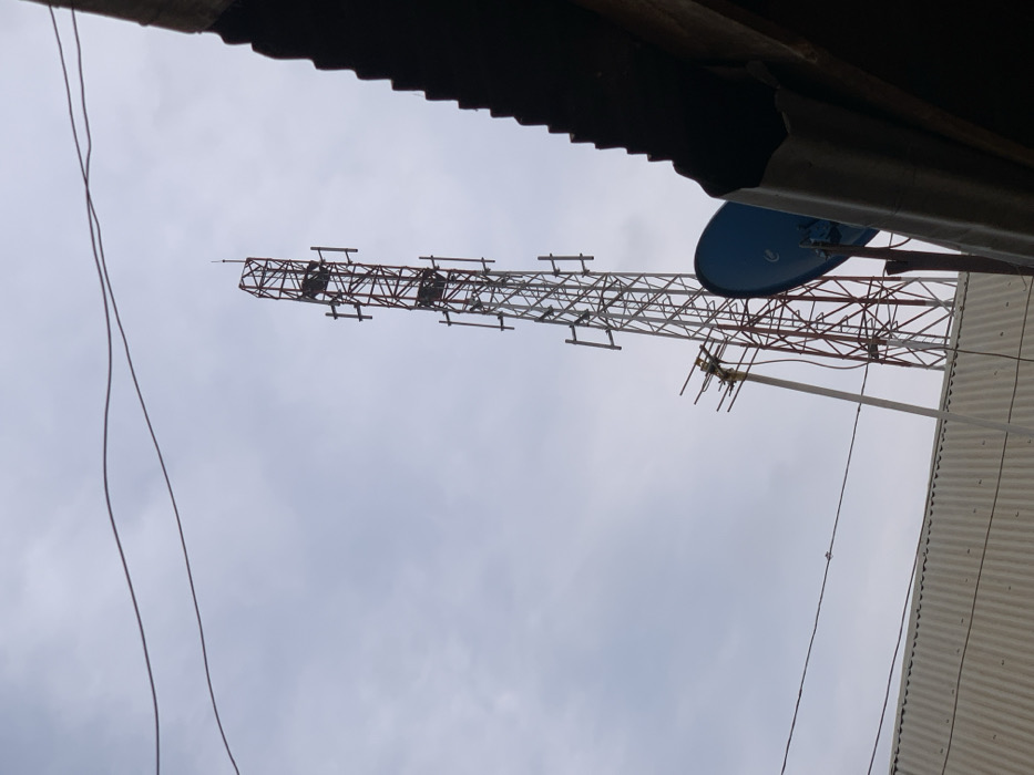 view from below, looking up at a metal radio tower against a cloudy sky. The tower is constructed from a lattice-like framework. A blue satellite dish is mounted to the side of the tower near the top. In the foreground, elements of a nearby building, including a corrugated metal roof and a section of a dark, overhanging eave, partially obscure the view. Power lines extend across the sky.