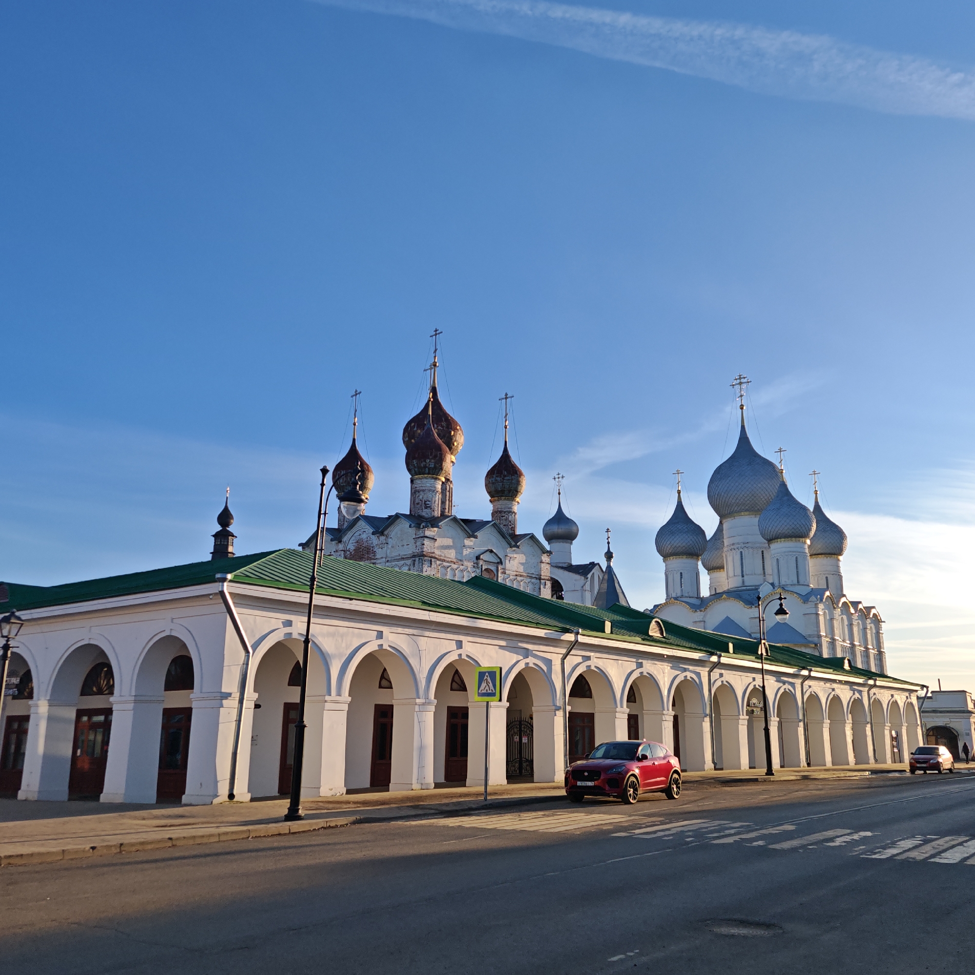 street view in Kladovitsy, Russia, featuring a long, white building with arches along the front. The building has a green roof, and behind it are multiple onion-shaped domes of a Russian Orthodox church, some silver and others copper-colored. A red car is parked on the street in front of the building near a pedestrian crossing sign. Another red car is visible further down the street. Street lamps are placed intermittently along the building's facade. The sky is clear blue with faint cloud streaks. The road in the foreground is grey with visible zebra crossing markings. There is no evident human activity apart from the presence of vehicles.