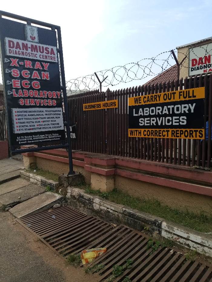 This image depicts the exterior of the Dan-Musa Diagnostic Centre, located on AJ 19 Yoruba Road/Lagos Street in Kaduna, Nigeria