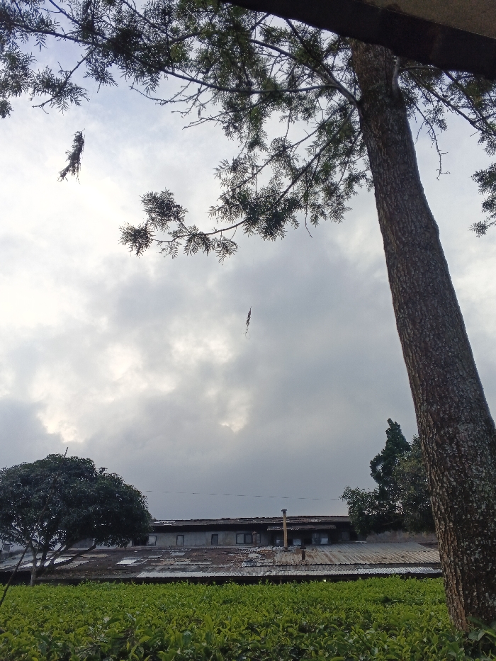 This image depicts an outdoor scene in Unknown, Cambodia, captured under an overcast sky with visible grey clouds. In the foreground, a dense field of short, green leafy plants, consistent with a tea plantation, occupies the lower third of the frame. Beyond this field, in the midground, a long, low-rise building with a corrugated metal roof is visible. The building's upper section features multiple small rectangular windows or openings, and several vertical pipes or vents protrude from its roof. To the left of the building, a mature tree with a dense, dark green, rounded canopy is present. On the right side of the frame, the thick, textured trunk and branches of a large tree extend vertically from the bottom to the top, partially obscuring the view. Various branches from this tree and others extend into the upper sky. Against the cloudy sky, two elongated, dark objects, appearing to be entangled plant debris or remnants, are suspended from upper branches. No individuals, discernible actions, or interactions are visible in the scene. A dark, narrow architectural element, possibly a beam or overhang, is visible along the top edge of the image.