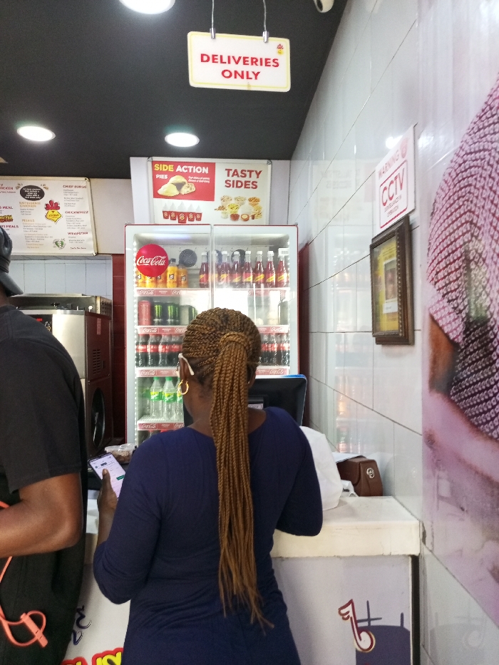 woman standing at a counter inside a restaurant, likely in Karonmajigi, Nigeria. The restaurant appears to be a fast food establishment, evident by the presence of a sign indicating "Deliveries Only", a glass-door refrigerator stocked with sodas and bottled water, and various food items mentioned on the menu in the background. The woman is using her cell phone and is wearing a dark blue dress, with long braids tied into a ponytail. In front of her, there is a white counter top, and there is a brown handbag resting on the counter. The background shows white tiles, and a poster that says "Warning, CCTV", and a poster with a patterned image. The overall atmosphere suggests that the woman is waiting for her order or making a payment at a food counter.