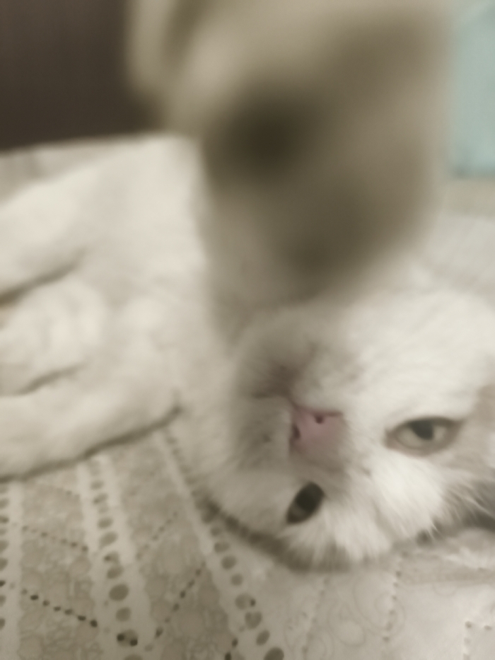 An indoor scene in Valchedram, Bulgaria, features a white-furred domestic cat. The cat lies on its back or side on a light-toned textile, patterned with circular or dotted motifs. Its head is inverted, displaying a prominent pink nose and one visible eye, directed towards the observer. A dark marking is present below the cat's nose. One forelimb is elevated and out of focus in the upper frame, partially obscuring a blurred dark background. A secondary blurred background area contains a light blue/teal hue. The image exhibits a shallow depth of field.