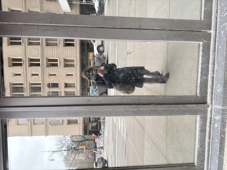 A person is reflected in a large, multi-pane glass window, taking a selfie with a smartphone held in both hands. The individual, appearing female, wears a dark, possibly navy or black, long coat, light-colored wide-leg trousers, and dark boots. Dark sunglasses cover her eyes, and a large, olive-toned or brown tote bag is slung over her left shoulder. Her dark hair falls to her shoulders. The window's dark, weathered frame divides the reflection vertically. The reflection captures a street scene typical of the Upper East Side, Manhattan, New York City, as indicated by the partially visible zip code "10028" and the visible word "BARNES" (likely part of a Barnes & Noble storefront) on a building directly across the street. The background shows a multi-lane city street with pedestrian crosswalks. Several vehicles, including dark SUVs and a silver sedan, are visible; some have snow remnants on their surfaces, indicating cold weather. A person in a red jacket is seen riding a light blue Citi Bike in the distance on the left side of the street. A traffic light pole with pedestrian signals is also present. The prominent building reflected directly across the street is multi-story with a light-beige or tan stone facade, featuring numerous windows, some rectangular and some with arched tops. Beyond the street and to the left of this building in the reflection, bare trees suggest proximity to a park, likely Central Park. The sky is overcast and bright gray. The lower portion of the reflection shows a light gray sidewalk and a dark, weathered window sill.