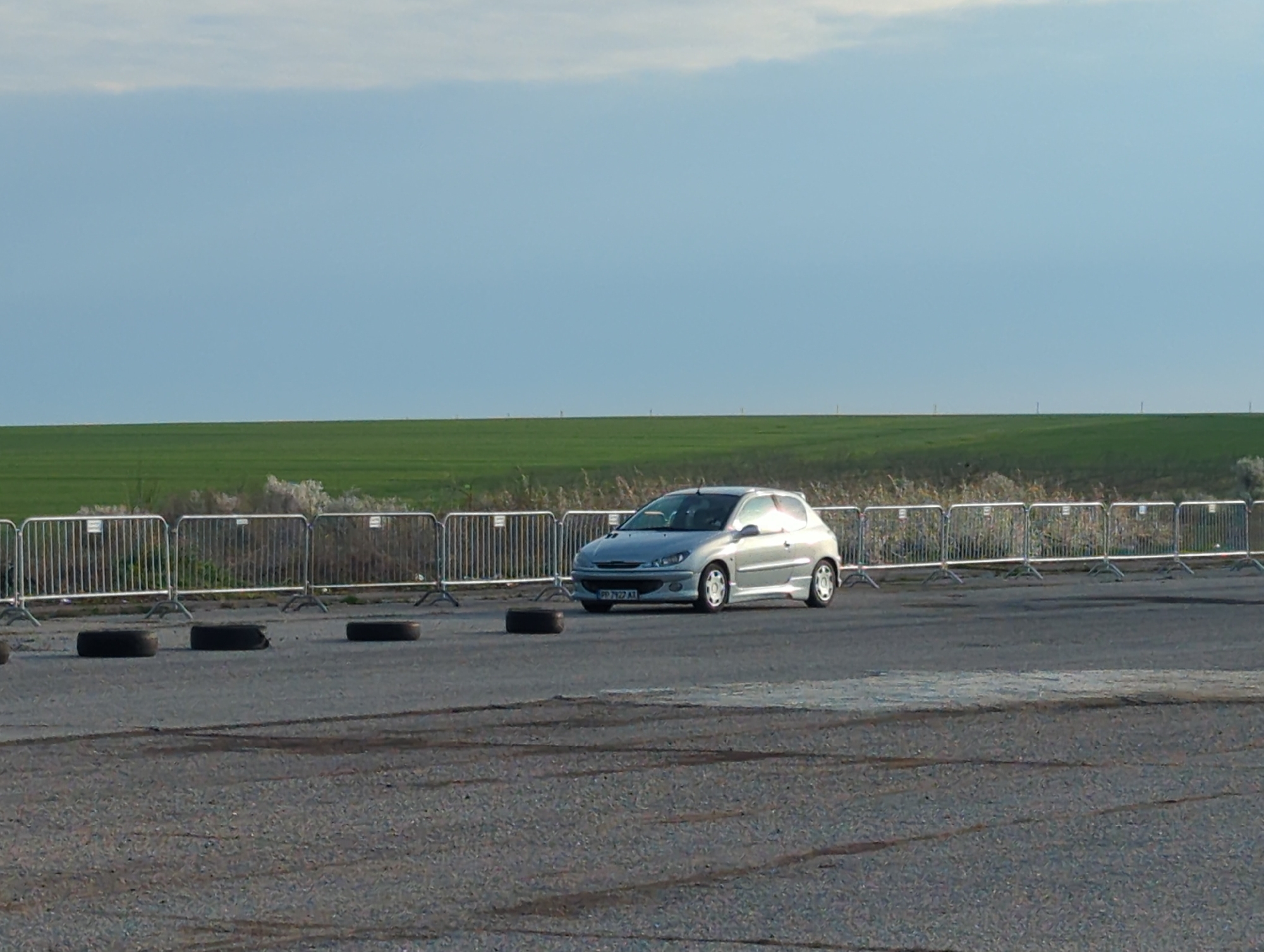 The image depicts a silver Peugeot 206 on a paved surface with tire marks. Behind the car is a row of metal barriers and a grassy field under a light blue sky with some clouds. Four black tires are visible in the foreground. The location is unknown and there is no evidence pointing to Ostrovo, Bulgaria. There are no people visible in the image.