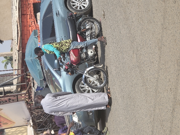 The image depicts an outdoor street scene in Suleja, Nigeria, under daylight conditions. The foreground features a grey asphalt road. In the midground, a light blue SUV, possibly a Toyota Venza, is stationary or parked with its front facing the left. To the immediate left of the SUV's front passenger side, a partially visible individual wears a yellow safety vest and green sandals. Centrally, an adult male, with his back to the camera, wears a light grey thobe and brown sandals, standing adjacent to the SUV's front passenger door. To the right of the SUV, a red Honda motorcycle is positioned. An adult male is seated on the motorcycle, wearing a light blue long-sleeved shirt, a yellow and black patterned vest, blue jeans, and sandals, with his left foot on the ground. He is looking towards the left of the frame. The background consists of various concrete and brick structures, some appearing incomplete or aged, with exposed rebar. A large, partially visible billboard structure is on the far left. Behind the vehicles, a large dark green market umbrella is visible. Sparse vegetation, including a palm tree, and a clear blue sky are present in the upper background. The scene suggests a temporary stop or interaction on a busy street.