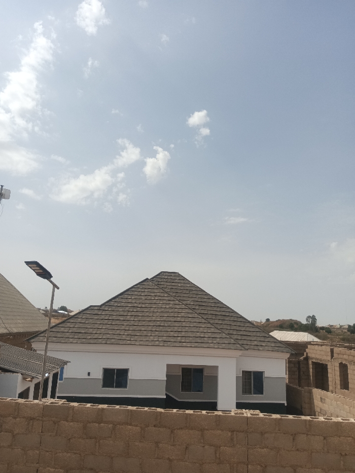 A single-story residential building, located in Kwang, Nigeria, is centered under a light blue sky with scattered cirrocumulus clouds