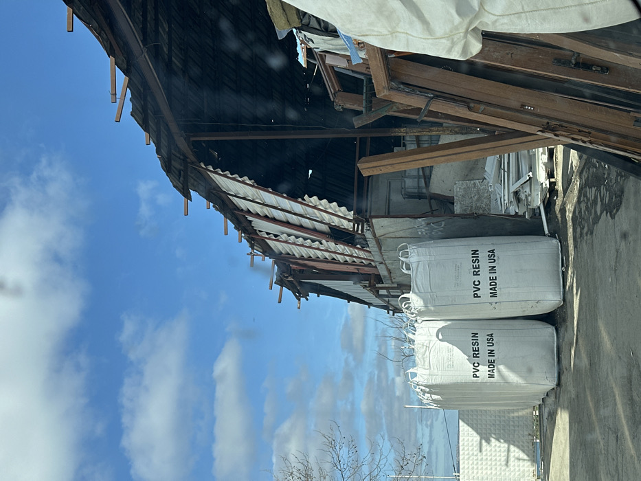 The image captures an outdoor industrial or storage area in Bağcılar, Turkey, under a partly cloudy blue sky. A large, partially dilapidated structure occupies the midground and background, featuring an exposed roof framework of corrugated metal sheets and steel beams. Several sections of the corrugated roofing material appear damaged or partially removed, revealing dark underlying material and internal supports. The upper wall of the structure exhibits vertical corrugated panels. To the left of the structure, a row of at least six large white Flexible Intermediate Bulk Containers (FIBCs) is visible. The two foremost bags are clearly labeled "PVC RESIN" and "MADE IN USA" in black capital letters. Further left, a light-colored, textured block wall and bare tree branches are visible. To the right, beneath the partial shelter of the structure's roof, a collection of discarded materials is present. This includes several wooden door or window frames leaning vertically against the wall, alongside a pile of white plastic profiles or pipes and other debris on the ground. A section of graffiti with the partial text "EARTH PVC" is visible on the lower portion of the structure's wall. No individuals are present in the scene.