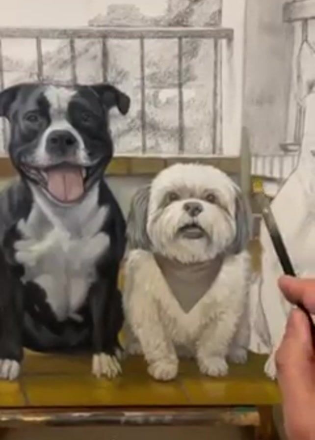 A person is painting a picture of three dogs on a canvas. The two dogs on the left are already colored in, while the one on the right is still being worked on. The dog on the left is a black and white Pitbull type dog with its tongue out. The dog in the middle is a small white dog with a brown "V" on its chest. The dog on the right is a white dog. The painting has a balcony or fence in the background. The paint used for the picture is visible at the bottom of the frame.