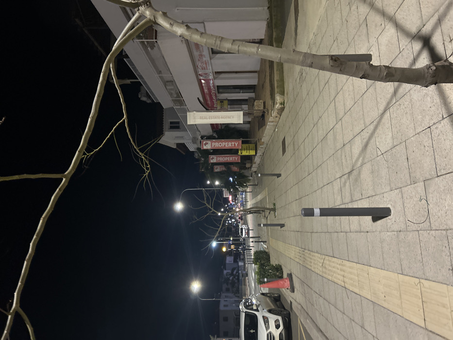 The image depicts a deserted urban street at night in Paralimni, Cyprus
