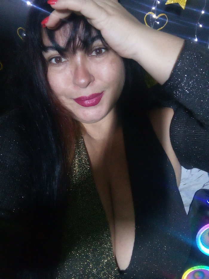 The image portrays an indoor scene located in the city of Juan Griego, Venezuela. A woman is captured in a close-up portrait, looking directly at the camera with a slight smile. She has long, dark hair with bangs, featuring some subtle reddish highlights visible on the left side. Her eyes are brown, and her lips are adorned with dark pink lipstick. She is wearing a black, shimmering top or dress with a deep V-neckline, which reveals cleavage. Her right hand, featuring red nail polish, is raised with fingers touching her forehead and bangs. The background is dark and decorated with multiple strands of small, warm-toned string lights, two golden wire heart-shaped ornaments, and one golden star ornament, along with a yellow fabric element. In the lower right portion of the frame, a white textured surface, possibly a pillow or bedding, is visible, alongside a dark electronic device displaying illuminated blue and green circular elements.