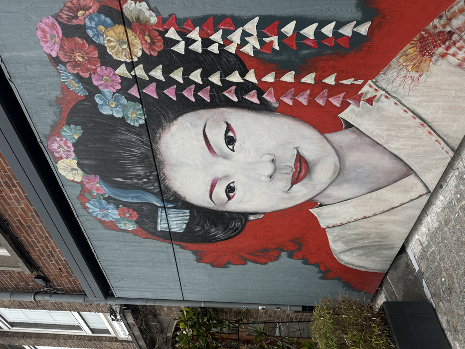 - "A large-scale mural depicting the bust of a female figure resembling a geisha dominates an exterior wall or paneling at street level in Antwerp, Belgium" by FM-MHDnZ2, licensed under CC BY 4.0