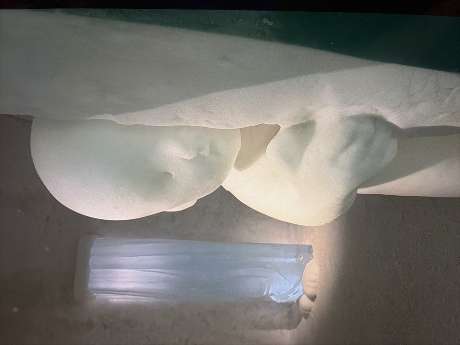 This image depicts an interior scene within an ice structure, characteristic of the ICEHOTEL in Kiruna, Sweden. A large, stylized sculpture of an infant or young child, carved from compacted snow or opaque ice, occupies the foreground on the right. The figure is light-colored, featuring smooth, rounded contours, and appears to be leaning against or emerging from a larger, vertical ice column, with its right arm and hand visible. The child's face is rendered with minimalist features, looking downwards and slightly to the left. In the background, to the left, a tall, translucent ice sculpture resembling draped fabric or a curtain is present, illuminated internally or from behind with a distinct pale blue light. The floor and surrounding environment are composed of white snow or ice, with subtle textural variations. The scene is illuminated by artificial light, creating soft highlights and shadows that emphasize the sculpted forms. No human individuals are present in the frame.