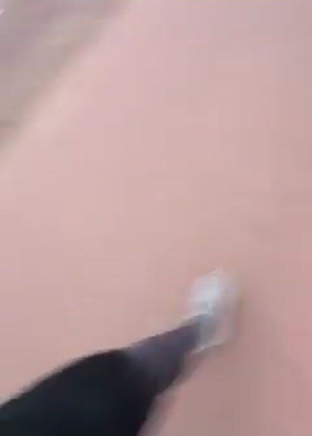A first-person perspective video shows someone walking through what appears to be a store aisle. The person's gloved hand is visible in the foreground, holding an object out of focus. The aisle has pink walls on one side and shelves stocked with various products on the other. The person walks forward. The lighting is bright.