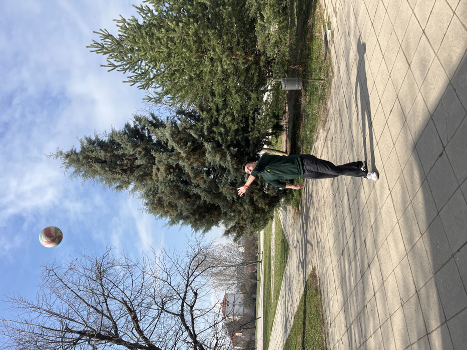The image depicts a male individual playing volleyball in a public park or green space located within Sofia, Bulgaria. The man, appearing to be in motion, is positioned on a light-colored paved path composed of square tiles. He wears a dark green long-sleeved polo shirt, dark trousers, and white Adidas sneakers with black stripes. His right arm is extended upwards and outwards, with his hand open, seemingly in the act of striking or tossing the volleyball. A red band or bracelet is visible on his right wrist. A white, red, and green patterned volleyball is captured in mid-air, slightly above and to the left of the man's extended hand, against a clear blue sky with scattered wispy white clouds. The background features a bifurcating "Y" shaped paved path, flanked by areas of green grass and some dry patches. To the left, a large deciduous tree with bare branches is prominent. To the right, two large evergreen conifer trees stand, one taller with bluish-green foliage, and another with lighter green needles. A grey, cylindrical metal trash bin is visible to the right of the man, near the base of the evergreen trees. In the distant background, several multi-story residential buildings are visible on the horizon. Strong sunlight illuminates the scene, casting distinct shadows of the man and trees onto the paved ground.