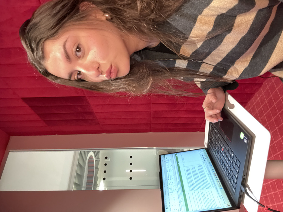 A young adult female is depicted in a modern interior setting within Bnei Brak, Israel. She is positioned slightly angled towards the camera, with long, dark brown hair and a fair complexion. Her lips are pursed in a "kissing" gesture, and a small stud is visible on her right nostril. She wears a gold-colored hoop earring in her right ear and a ring on her right ring finger. Her attire includes a striped, zippered top with horizontal bands of dark grey/black and beige/light brown. Her right hand rests on the palm rest of a black laptop, which is open on a small, white, circular table. The laptop screen displays a spreadsheet program, likely Microsoft Excel, with green header rows and text entries visible. A black cable is plugged into the left side of the laptop. The background to the right features a wall covered in bright red, vertically ribbed acoustic panels. To the left, a glass partition with a pattern of dark circular dots reflects an interior space containing white walls, recessed lighting, and a curved ceiling element. The floor beneath the table is covered with a patterned red carpet. The environment appears to be a private workstation or booth within a contemporary office or co-working space.