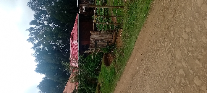 The image depicts an outdoor scene in Kinale ward, Kenya, under an overcast sky. In the foreground, a light brown dirt road with visible rocks and uneven texture traverses from the lower center towards the mid-left. Green grass flanks the right side of the road, leading to a simple wooden post fence. Beyond this fence, a rustic wooden gate, composed of vertical planks and horizontal supports, stands slightly ajar or aged. Behind the fence and gate, a cultivated plot of green plants is visible. Further back, a single-story structure with dark walls and a prominent red corrugated metal roof is present. To its left, partially obscured by dense green foliage, is another building, also featuring a red roof. Tall, dense eucalyptus or similar trees with dark green foliage form a thick line in the background, extending across the upper portion of the frame. No individuals, animals, or explicit actions are observed within the scene.