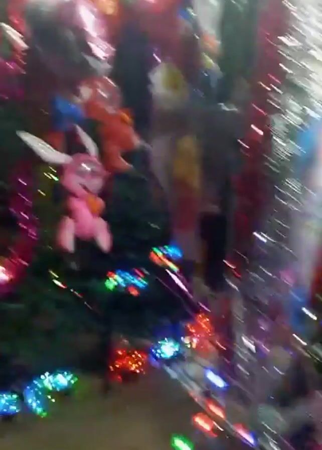 n outdoor display of Christmas trees. The trees are adorned with various decorations, including colorful lights, tinsel, and inflatable balloons shaped like cartoon characters such as a Santa Claus, fish, and rabbit. Another tree decorated in white and red colors can be seen to the side. A man walks by the display in the background. The scene appears to be at night with a street or outdoor environment. A sign for a pharmacy is visible in the background. The camera angle and lighting create a slightly blurry effect, but the decorations and the environment are still discernible. Loud traffic sounds are audible.