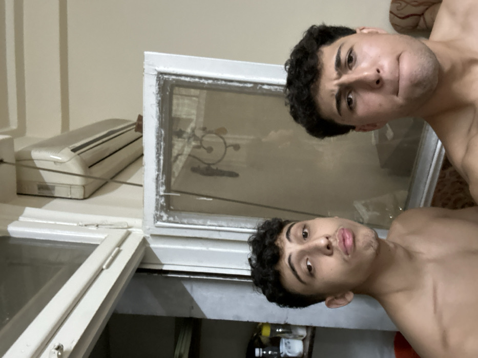 Two shirtless young adult males are depicted in an indoor residential setting. The male on the left, centered in the frame, faces forward with dark curly hair and is shown puckering his lips. The male on the right, partially visible from the chest up, has dark curly hair and is looking directly at the camera with a neutral expression, his lower lip slightly bitten. In the background, to the left, a white-framed door or window is ajar, revealing shelves holding various bottles and containers. To the right, a weathered white-framed glass panel or screen door reflects an ornate interior light fixture. Above this panel, a white wall-mounted air conditioning unit is visible. The surrounding walls are light-colored, and a segment of patterned upholstery, possibly from a sofa or chair, is visible on the far right. The specific location within As-Salihiya Municipality, Syria, cannot be determined from the visual information present in the image.