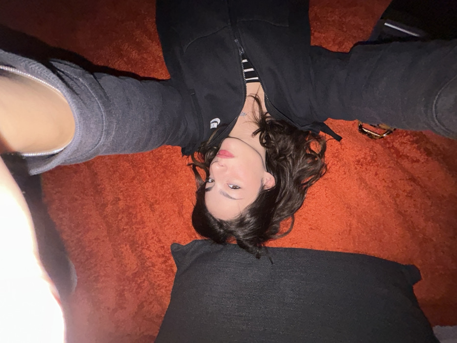 A young female is depicted lying on her back on an orange shag rug in an indoor setting. Her head rests near a dark-colored pillow. She wears a black zippered hoodie over a black and white striped top, with a silver-colored necklace visible. Her dark, wavy hair is spread around her head. Her eyes are open, and she looks directly towards the camera, with a slight upward tilt of her chin. Her lips show a reddish tint. Her right leg is bent and elevated, obscuring the upper portion of the frame. A pair of sunglasses with brown tortoise-shell frames is situated on the rug near her left arm. The image does not contain visual identifiers for Strasbourg, France.