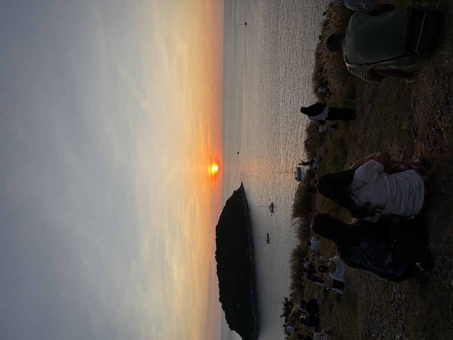 The image depicts an elevated coastal landscape at sunset, identified as Promthep Cape (Laem Phromthep) in Rawai, Phuket, Thailand. The horizon features a prominent, orange-red sun disc reflecting across the Andaman Sea. The sky transitions from a light grey-blue overhead to vibrant orange and yellow tones near the horizon. To the left, a dark, densely vegetated island (Koh Man) is silhouetted against the setting sun. Approximately five sailboats or yachts are visible on the water. The foreground comprises a dry, grassy hillside interspersed with taller grass stalks. Numerous individuals, estimated between 20-30, are gathered on the hillside, predominantly seated or standing with their backs to the camera, all facing the sunset. In the immediate foreground, two individuals are seated, their backs to the viewer; one wears a dark top, the other a white t-shirt and patterned bottoms. To the far right, a third individual in a dark green top with a shoulder bag is partially visible, also seated and facing the sea. A standing individual in the mid-right wears a white top, dark skirt, and dark head covering, observing the vista. All observed actions are consistent with viewing a sunset.